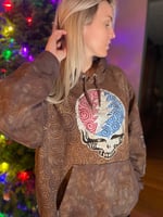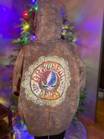 The front has a stealie with pink/red and light blue/blue spirals and brown spirals covering the entire chest except for the pocket.