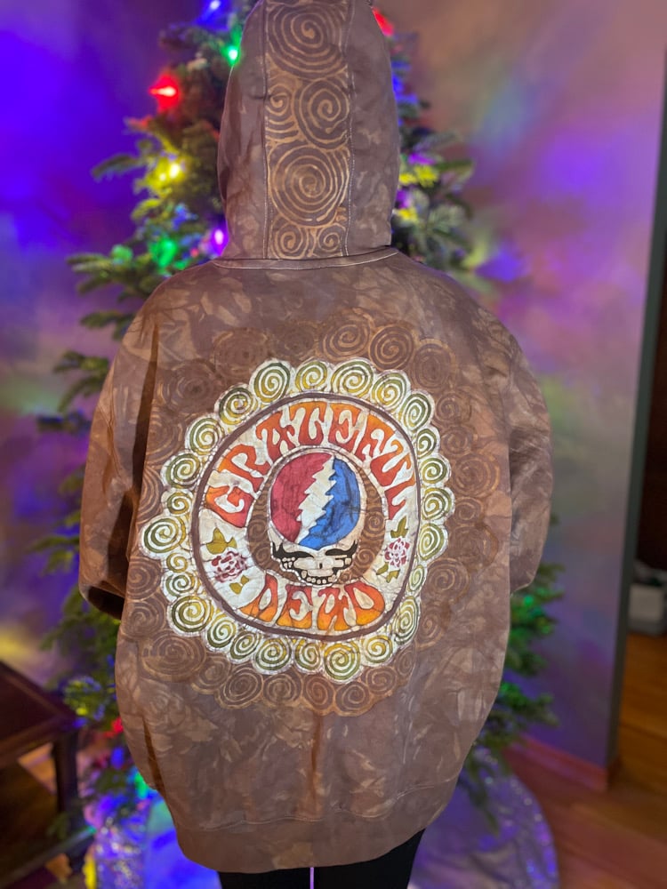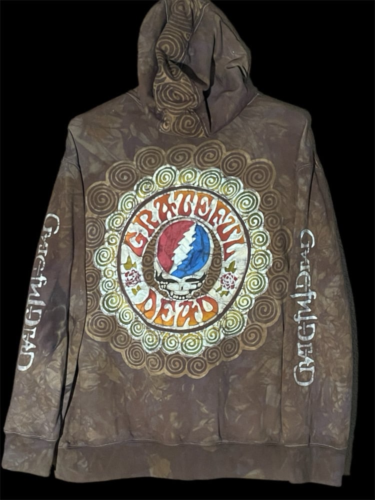 The back has a large circle with the words “Grateful Dead” in ombre font and a stealie side of the center of the circle. the circle is framed with more spirals.