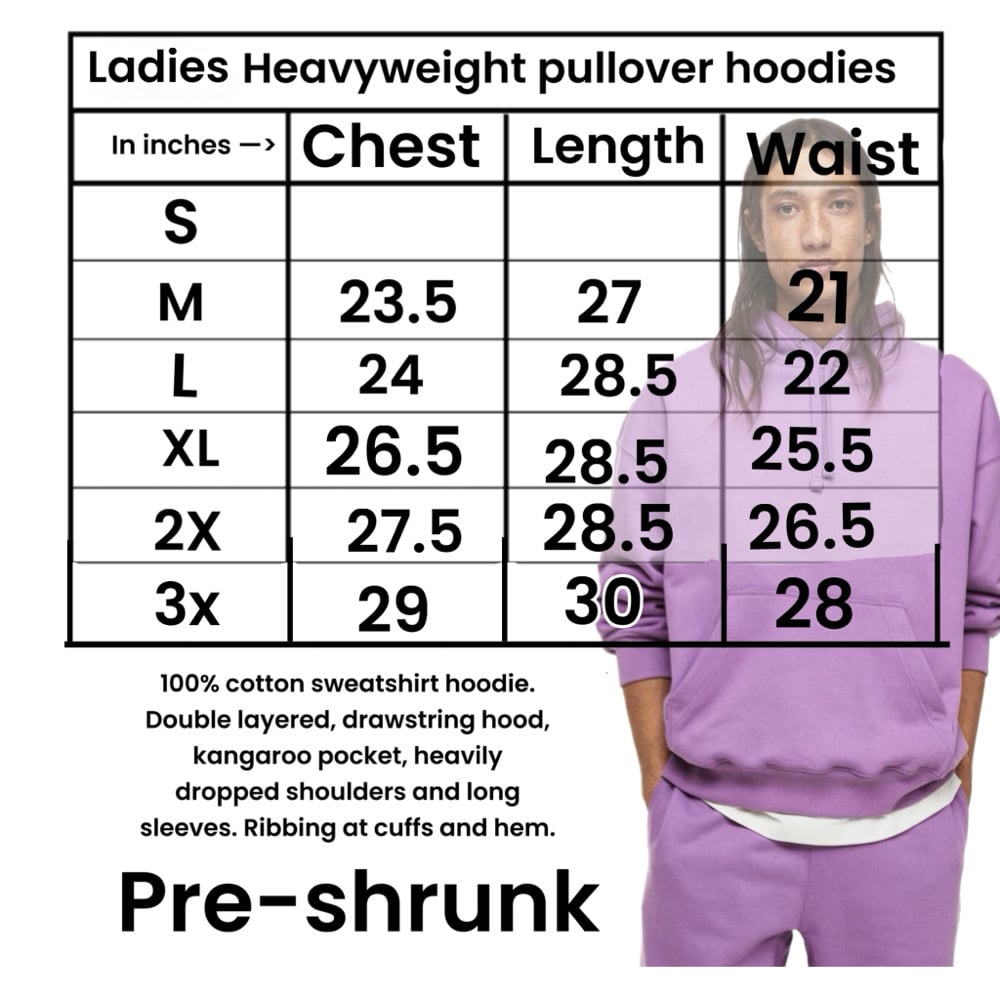 Ladies size 3X pullover hoodie in thick cotton fabric. Double layered, drawstring hood with grommeted holes, kangaroo pocket. Long sleeves and ribbing at cuffs and hem.