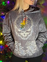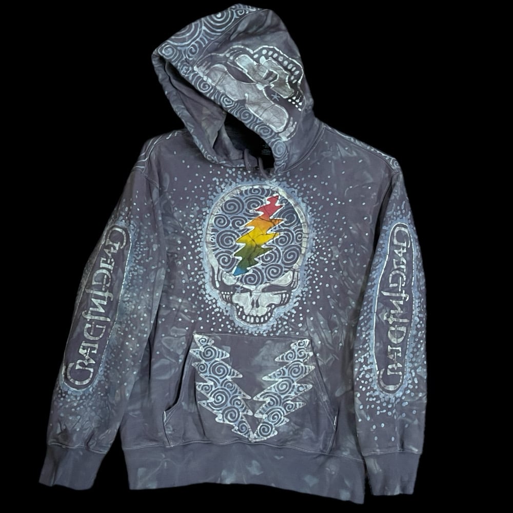 The front has a stealie with spirals inside and framed by ever expanding light blue dots and the front pockets have mirroring bolts with spirals.