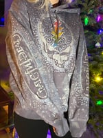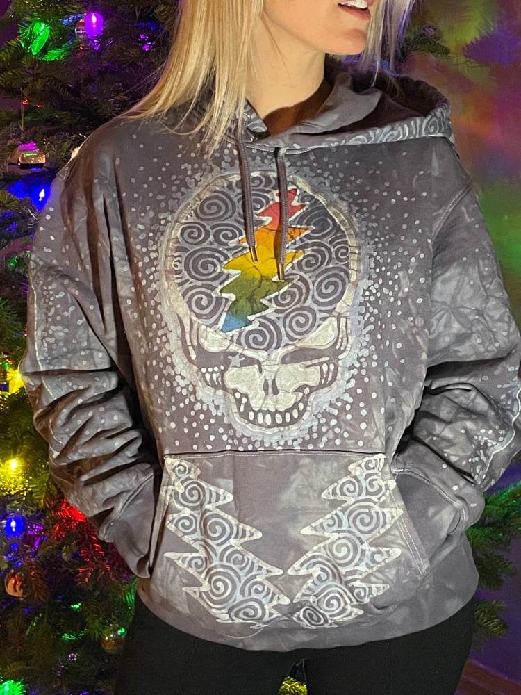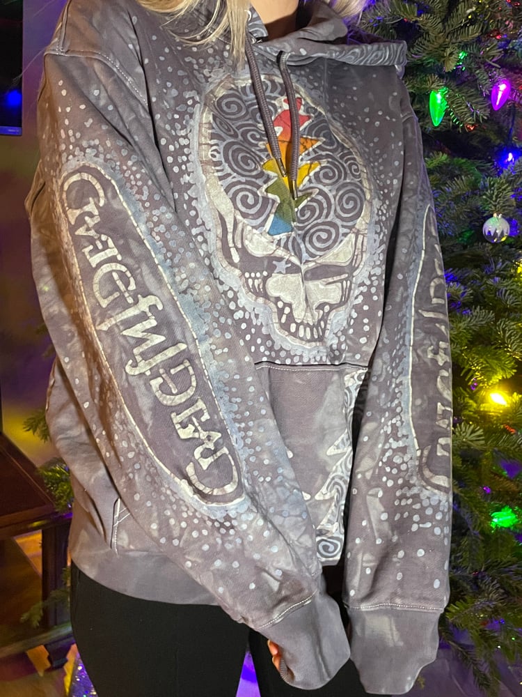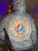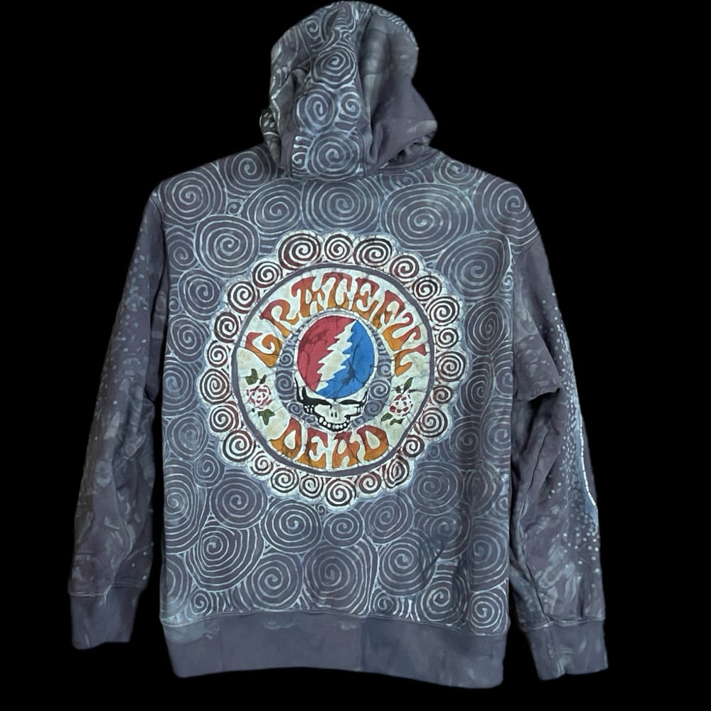 The back has a large circle with the words “Grateful Dead” in ombre font and a stealie side of the center of the circle. the circle is framed with more spirals.