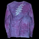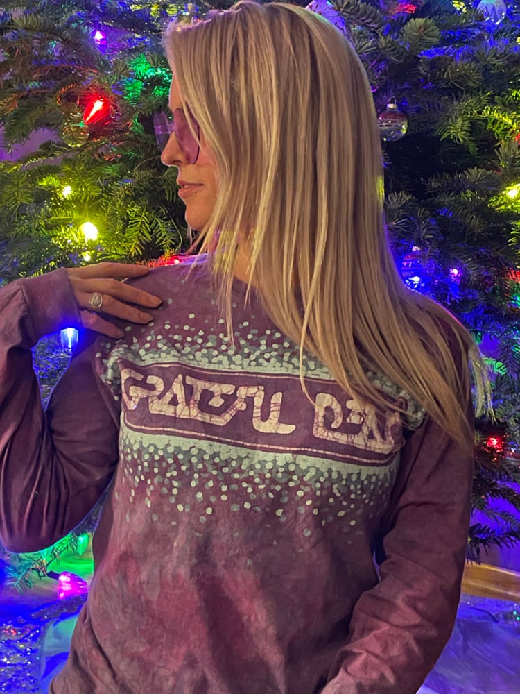 Despite its subtle look, this design actually took 4 days to create. Each color you see encircling “Grateful Dead” was a separate dye bath, including one for the main purple color!