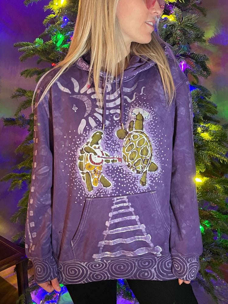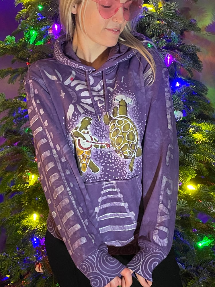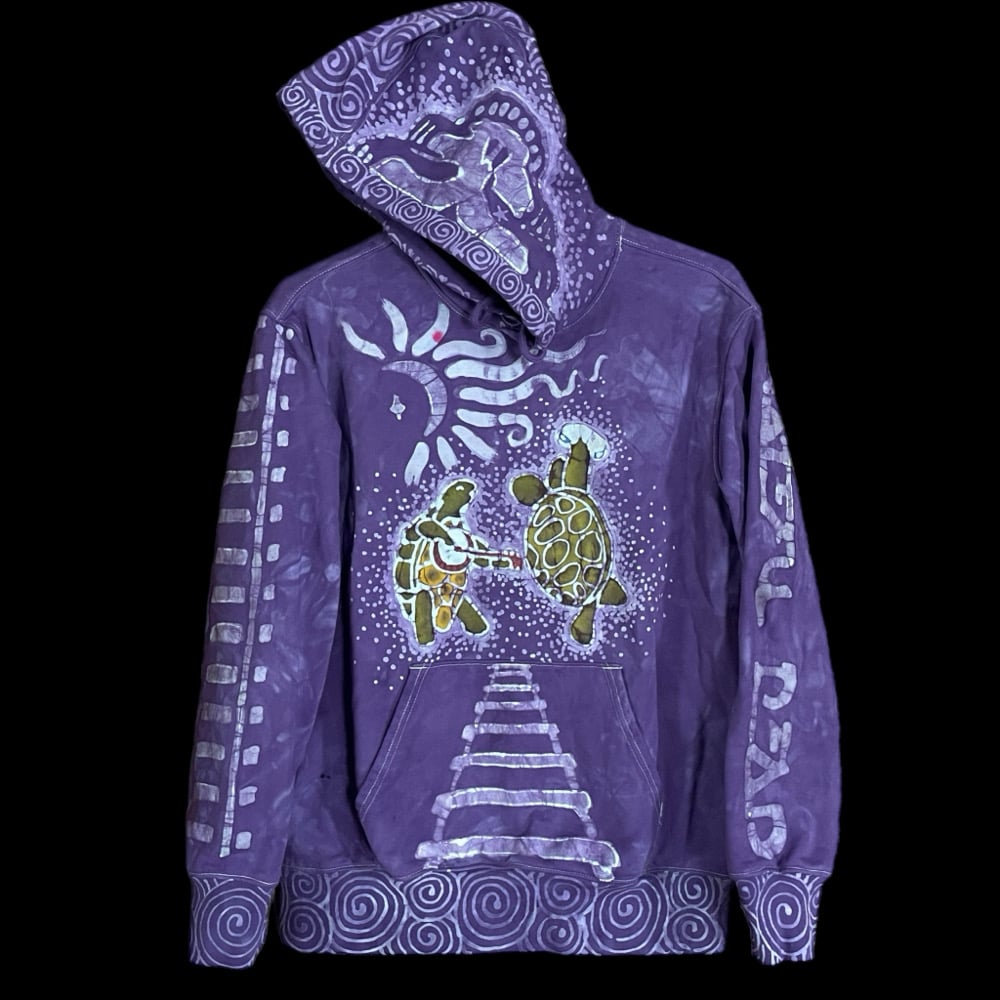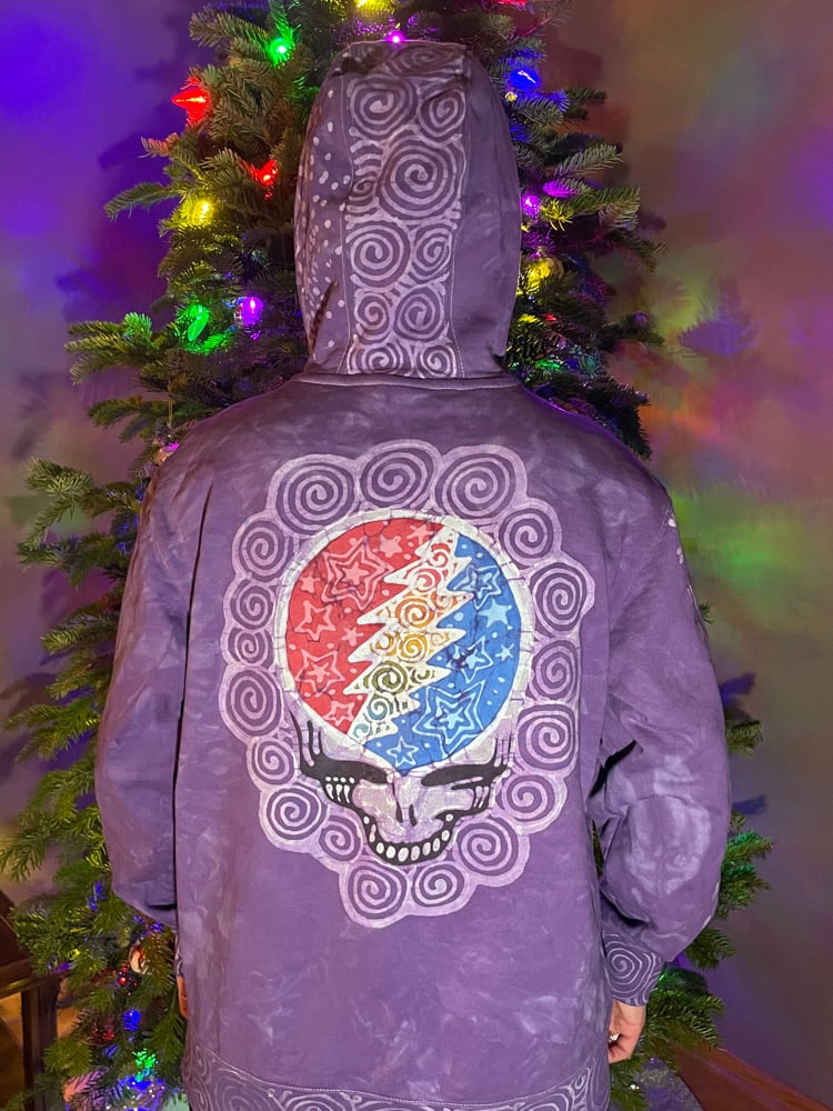 The front has terrapins dancing under a crescent moon. The pocket has railroad tracks leading to the terrapins. One of the sleeves says “Grateful Dead” down the length, the other has a length of railroad tracks. Bottom hem, cuffs and hood border all have spirals. The hood also has spirals going up the center and a stealie along the side. On the back there is a large stealie with stars adorning the inside and spirals framing the piece.