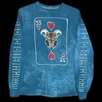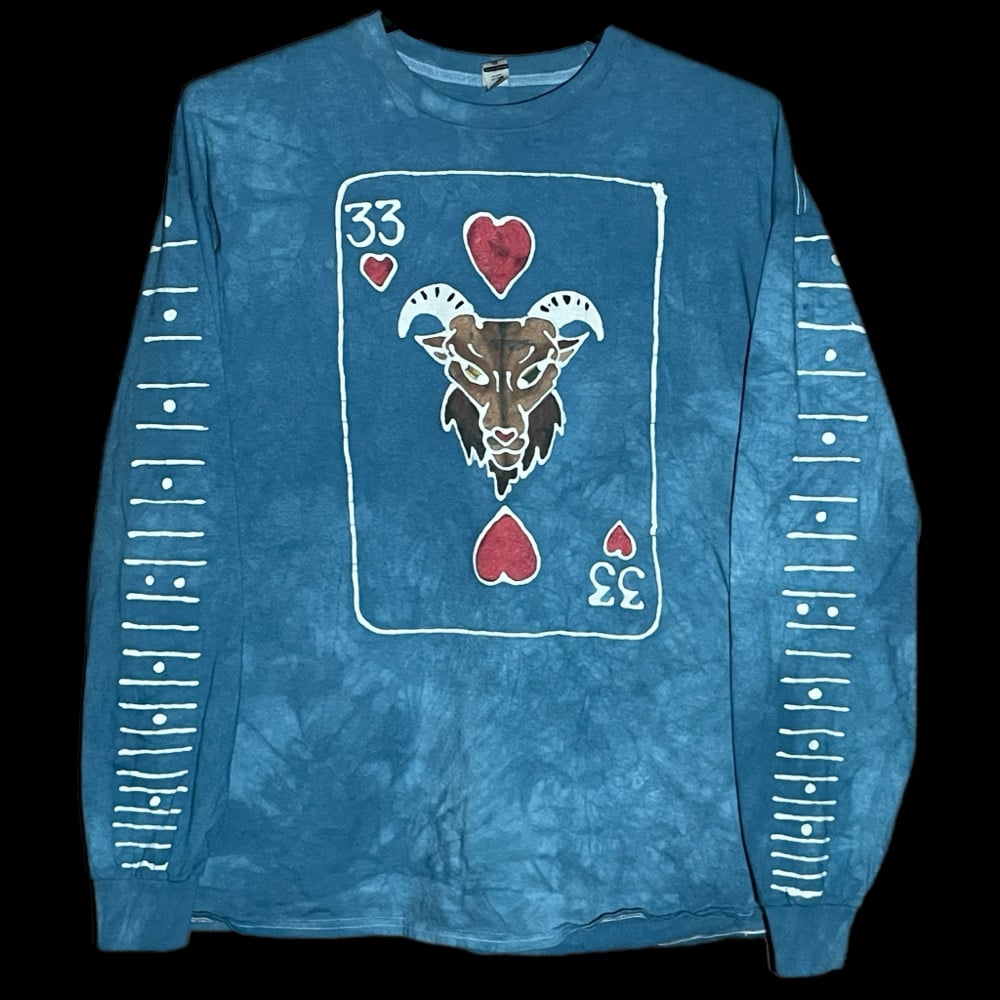 The front features a 33 of hearts playing card with a goat as the center heart. The sleeves have the frets of a guitar neck and the back has the letters BMFS in large font reaching from shoulder to shoulder on a dark blue shirt.